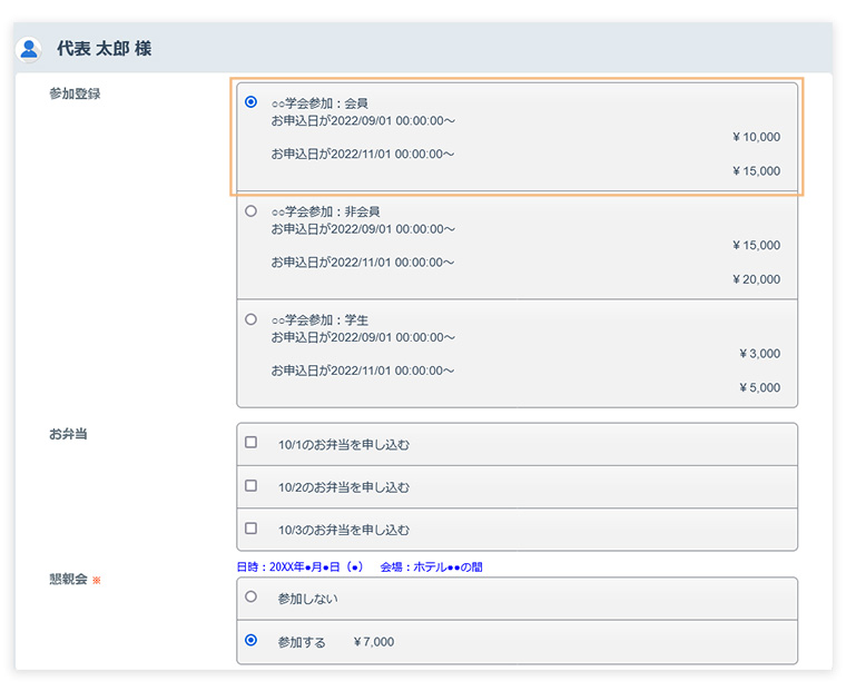 申込日により参加費など金額の変動設定も可能です。